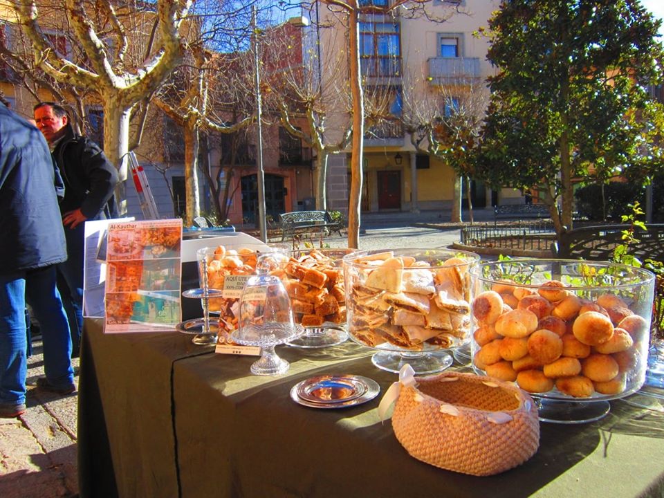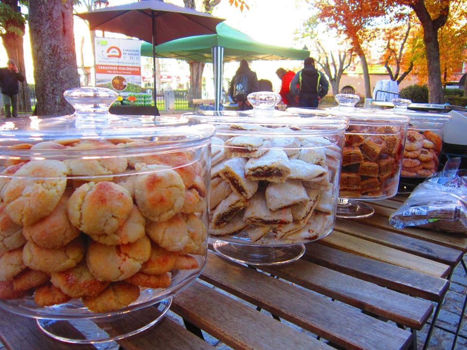 Nosotras estamos en todos estos mercados con nuestros deliciosos pastelitos ecológicos; baklava de cacahuete, canela y agua de azahar; bollitos rellenos de dátiles, aromatizados, también, con canela y agua de azahar, más un toque afrancesado de mantequilla; bolas de almendra y limón; y pastitas de almendra y mermelada de albaricoque con nueces.