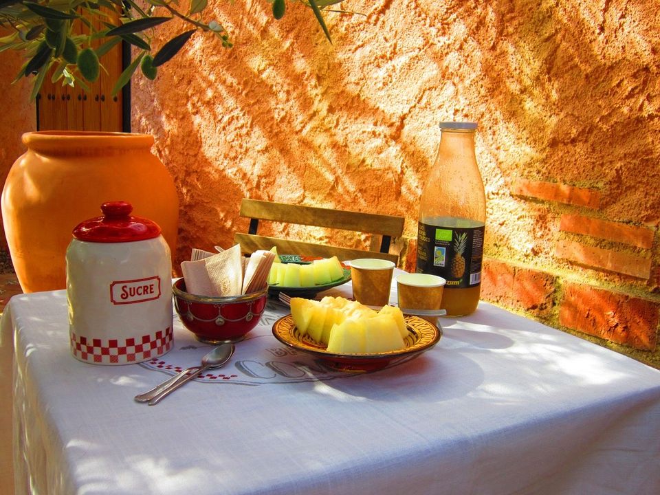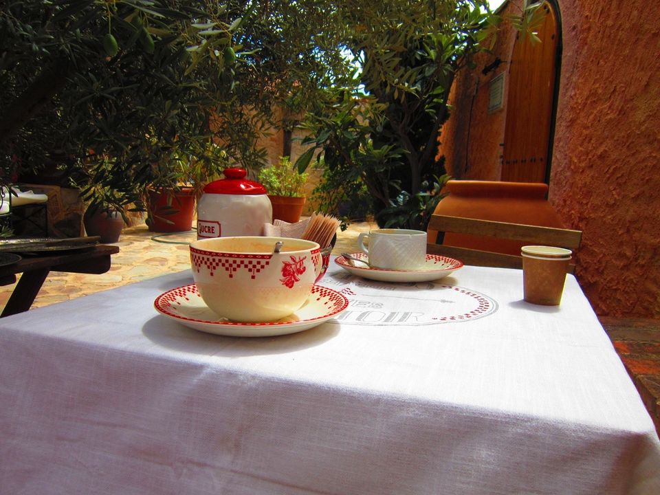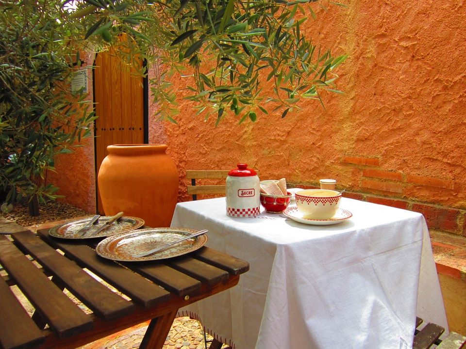 Es ideal preparar la mesa con la decoración provenzal al lado del olivo y con el sonido de la fuente al lado, mientras te tomas un pan bio de nueces y pasas con mantequilla eco y mermelada de albaricoque y un delicioso café ecológico.
