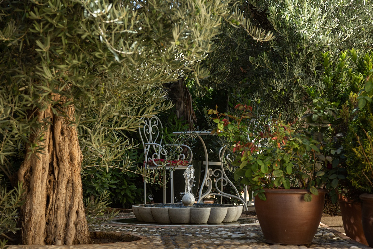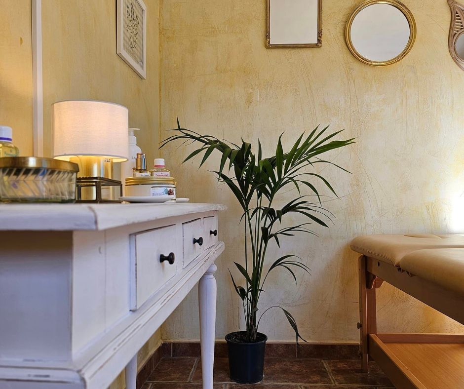La sala de masajes es una pequeña sala con una decoración acogedora que invita a la desconexión y está ubicada en el jardín de Beautiful Alamedas, un jardín de inspiración árabe con olivos, naranjos, fuentes y limoneros.
