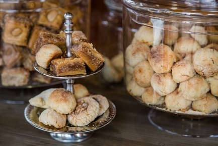 Cuatro tipos de pastelitos podrá degustar quien entre a Al-Kauthar; baklavas de cacahuetes, bollitos rellenos de dátiles, bolas de limón y almendra, pastas de almendras y albaricoque, todos ellos son exquisitas ambrosías bio propias de la repostería hispano-andalusí, cuyos sabores se intensifican con el perfume del agua de azahar, el exotismo de la canela y el dulzor de la miel.
